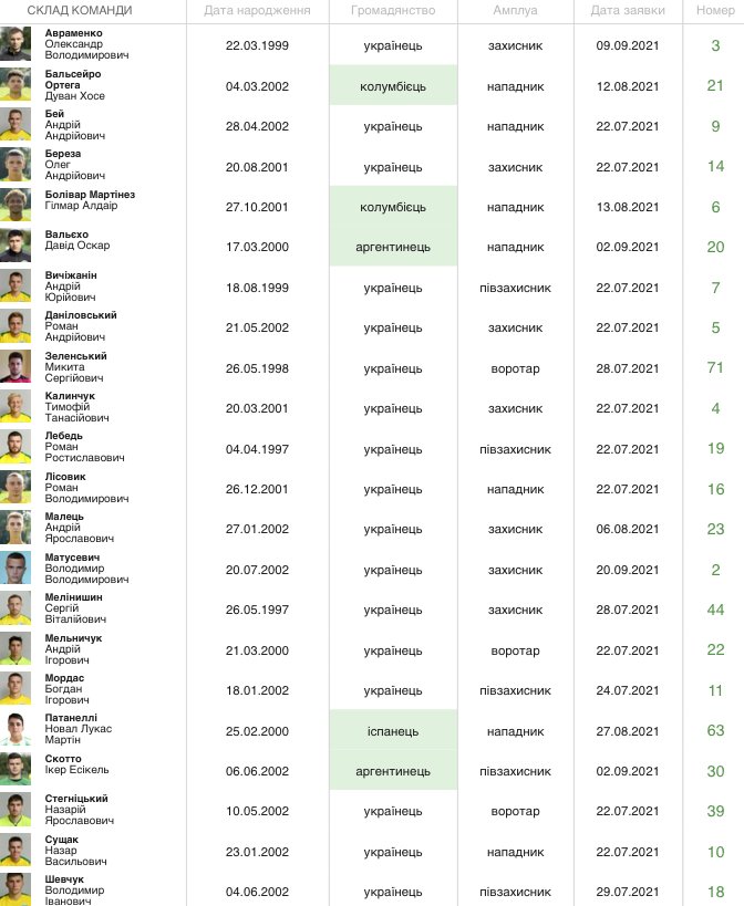 Склад Карпат на сезон 21/22