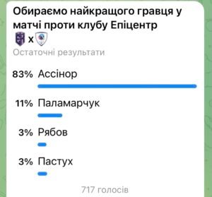 Після кожного матчу ексклюзивно у нашому телеграм-каналі вболівальники голосують за найкращого гравця матчу. На цей раз у цьому голосуванні за звання найкращого гравця змагалися: Ассінор, Паламарчук, Рябов, Пастух.